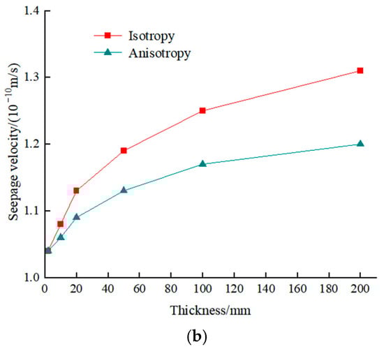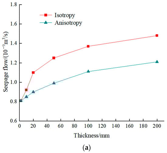 26], thereby simplifying the simulation calculations and reducing the computational workload. In this study, the composite geomembrane was initially analyzed under the assumption of seepage isotropy. The equivalent permeability coefficient was calculated using Formula (8), and the results are presented in
