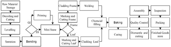 The production of cold room doors follows an established sequence developed by the industry. Lean, TRIZ, and simulation are versatile sets of tools and methods for innovation and process improvement, which can be combined with many different tools. Lean manufacturing has emerged as the definitive philosophy for reducing process and supply chain waste, and lean-TRIZ has been used to resolve inventive problems (TRIZ) when processes stagnate []. Individually, numerous papers have discussed the implementation of the above concepts. Results from literature research demonstrate that while TRIZ tools have been used in conjunction with other tools for process improvement, most of the research results are not applicable to practice, and case study implementation is sparse [].
