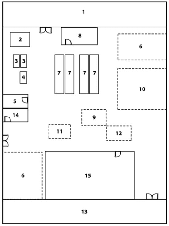 Floor layout and details. Note: 1. Raw material store, 2. Decoiling and cutting station, 3. Cutting L/F and serration station, 4. Priming station, 5. Mini Store, 6. Marking and cladding, 7. Chemical filling, 8. Chemical Room, 9. QC and Inspection, 10. Welding station, 11. Assembly station, 12. Packing, 13. Finished goods store, 14. Floor manager office, 15. Administration office.
