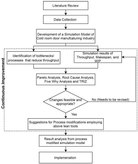 The study begins with an introduction to the cold room manufacturing process and establishes the problem statement in Section 1. Section 2 discusses literature related to lean tools and simulation models, critically analysing existing literature and identifying research gaps. Section 3 details the methodology framework and objectives of the study. Section 4 presents the development of a simulation model for cold room manufacturing across five door types, with results analysed using tools such as Pareto charts, cause-and-effect diagrams, 5-whys analysis, and TRIZ. In Section 5, the results are presented and discussed before and after the implementation of lean, focusing on makespan, work-in-progress (WIP), and throughput for each door type. Finally, Section 6 concludes the study.