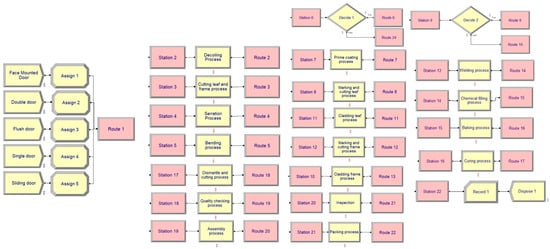 Additionally, it provides statistical analytic tools for examining behavioural variability in the system. Users can define a probability distribution for each input variable and observe how these distributions affect the system’s output. Altogether, these results provide a comprehensive understanding of system behaviour, facilitate informed decision-making, and support efforts to optimise and improve processes across various industries, including manufacturing, logistics, healthcare, and service operations. A simulation model based on the workflow in the process chart was created using the Arena software. Figure 4 shows the developed model for the production process in the plant. The time study analysis is performed, and the actual processing times are captured. These times were converted into a suitable statistical distribution using the input analyser. All input parameters associated with the model are shown in Table A1 (ANNEXURE), and corresponding time study data for all five doors are provided in Table A2. The best-fit statistical distribution for cutting frame and welding is provided in Figure A1A,B. The company manufactures five doors for cold rooms, which are analysed using the simulation model. Each door type undergoes 18 steps or processes to complete the production process, from raw materials to finished goods. The simulation results enable us to evaluate the throughput, makespan, and WIP, and identify bottlenecks in the production scenario.