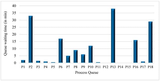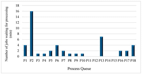 The evaluated simulation results, as shown in Table 2, align with the actual output statistics for each year of production at the company. The eighteen processes are represented as P1 to P18 in the order of P1—decoiling and cutting, P2—cutting leaf and frame, P3—serration, P4—bending, P5—prime coating, P6—marking and cutting leaf, P7—cladding leaf, P8—marking and cutting frame, P9—cladding frame, P10—welding, P11—chemical filling, P12—baking, P13—curing, P14—dismantle, P15—quality check, P16—assembly, P17—inspection, and P18—packing. The waiting times and number of waiting are plotted to identify the bottleneck. Table 2 presents the average number of finished products produced annually, aligning with the company’s actual output statistics for the same period. Table 2 also shows the makespan and WIP of the product, which represents the total time required to produce one unit of a door and the average number of units of doors still undergoing processing in a year, respectively.