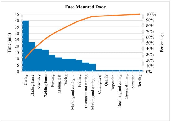 In this study, Pareto analysis was employed to assess all processes within the cold room door manufacturing plant. The analysis focused on process timings, including de-coiling and cutting, cutting leaf and frame, serration, bending, priming, marking and cutting frame, marking and cutting the leaf, cladding frame, cladding leaf, welding frame, chemical filling, baking, curing and cutting, quality control, assembly, packing, and inspection. A detailed record of the process timings was maintained, with 15 readings taken for each process. The average timing of these readings was then used to create a Pareto chart, which was plotted for each process across the five types of doors under study. The Pareto chart facilitated the identification of common bottlenecks present in all five types of doors. The analysis led to insights that informed process modifications aimed at reducing bottlenecks and enhancing overall productivity. The Pareto chart revealed that the curing process emerged as the most time-consuming, constituting 35–40% of the entire cold room door production. This insight guided the study in proposing various process modifications to streamline the welding and curing process, thereby lowering the overall process time. The proposed modifications aim to enhance productivity throughout the manufacturing plant.