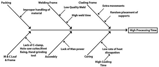 According to the Pareto analysis, it is inferred that curing, welding frame, packing and quality control, cladding frame, and assembly account for 80% of the problems in the manufacturing plant. Out of those, curing, welding frame, and packing were analysed as the most time-consuming and problematic processes based on the simulation results. It was inferred from Figure 8 that the processes after curing, packing, and welding the frame had no queue, which indicates that these processes hold unfinished jobs due to high processing times, thereby slowing down the process flow. Therefore, these problems were taken into consideration and modified. Figure 8 shows the cause-and-effect diagram, which identifies the possible causes of each problem identified through Pareto analysis, contributing to the high processing time.