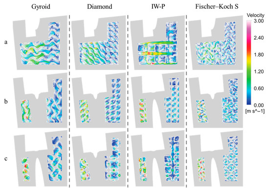 - The Diamond structure achieves the highest convective heat transfer coefficients and the lowest thermal resistance across the tested velocity range, indicating its outstanding cooling effectiveness. Gyroid performs closely behind Diamond, both outperforming the I-WP and Fischer–Koch S structures.