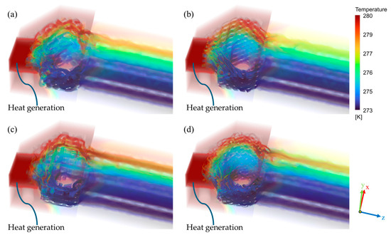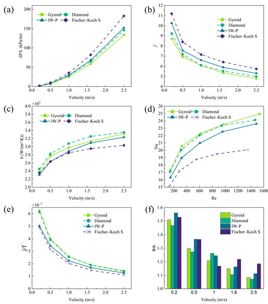 - Among the four TPMS topologies, the Fischer–Koch S structure exhibits the highest flow resistance and pressure drop, resulting in poorer thermal performance. In contrast, the Gyroid and Diamond structures demonstrate superior hydraulic efficiency with lower pressure losses.