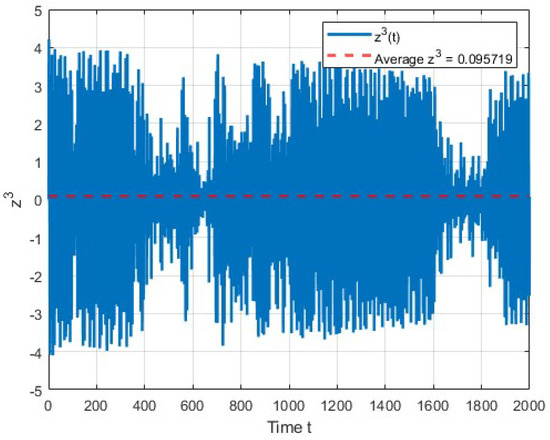 In this section, the fourth-order Runge–Kutta algorithm programmed in MATLAB ode45 is used for numerical simulations. Taking into account the value of a typical parameter of and the initial condition (IC) of , the system described by (1) exhibits complex dynamics, such as hyperchaos as shown in Figure 2. By applying Wolf’s method [37] and considering a time length of 500 s and testing the behavior of the trajectories, the four finite-time Lyapunov exponents are calculated as , , , and , where . The corresponding Kaplan–Yorke dimension () is then calculated as below: