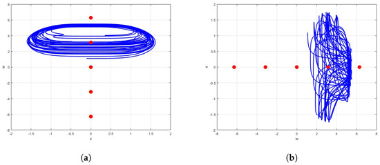 where K is the largest integer matches and . Consequently, is determined to be 4, indicating the presence of a strange attractor. This observation highlights the conservative nature of the proposed system, given that the dimension matches the dimensionality of the system. Figure 2a–d display projections and phase trajectories of the system (1) in various planes, the red dots are the equilibrium points where .