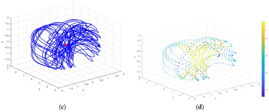 Phase trajectory of system (1): (a) ‘’, (b) ‘’, (c) 3D ‘’, (d) projection of ‘’. The red dots are the equilibrium points where .