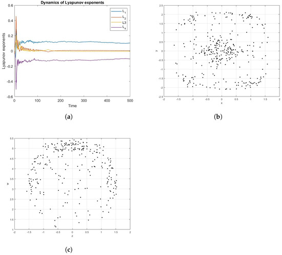 The Lyapunov exponent curves are depicted in Figure 3a. Furthermore, Figure 3b,c illustrate the Poincaré sections on the plane while and the plane during next reach a steady state (i.e., ).