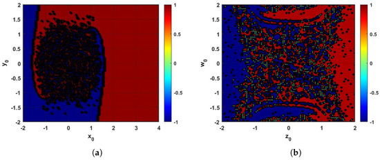 In addition, the analysis of attraction basins serves as an additional tool for investigating dynamics. Figure 4 shows the basins of attraction for the dynamics of the system (1) with , achieved by varying two initial conditions while maintaining the other two at zero. The basins of attraction are visualized in Figure 4a in the plane with and , and in Figure 4b on the plane with and . To prevent torus attractors, the intervals for the initial conditions are selected. The colors red and black correspond to periodic and chaotic solutions, respectively, with the colors representing periodic solutions encoding the period.