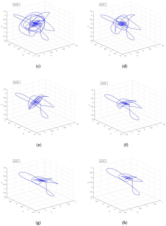 Here, we present a numerical simulation of system (1) with commensurate fractional orders. We observe chaotic behavior that arises upon the application of the fractional-order derivative. A comparison of the geometries of the attractors is used to analyze and demonstrate the influence of the fractional-order operator according to the modification of the operator. Therefore, we set the initial conditions to , a step size of , a time , and a value of . Different attractor forms are achieved by changing the order q while keeping the value of the parameter . The chaotic motion in the fractional Equation (13) appears when the orders of the fractional derivatives vary within the interval . Furthermore, the sum of all Lyapunov exponents is nearly zero, indicating that the system preserves its conservatism. The computed Lyapunov exponents in Table 2 indicate that the new system exhibits hyperchaotic behavior. In the solutions of the fractional-order system, when the fractional orders fall within the interval , two positive, one negative, and one zero of the Lyapunov exponent exist. The fractional-order system (13) is chaotic for . Furthermore, the Kaplan–Yorke value, as shown in Table 2, decreases as the order decreases, highlighting that the chaotic characteristics decrease as the order decreases.