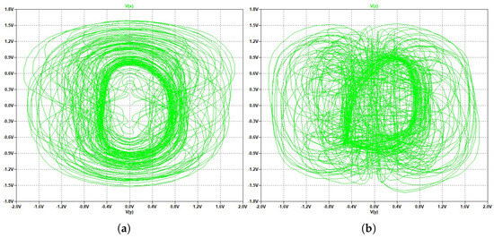where the environment is provided in Figure 7. The four state variables are implemented using four integrators (LT1057A). Additionally, a sinusoidal voltage generator is engaged. Operational amplifiers (OpAmps) are the basis of the integrator circuit design. The values of the capacitors are set as nF; and the resistors are determined as kΩ; kΩ, kΩ. Moreover, the supply voltages for the OpAmps are specified as V and V.