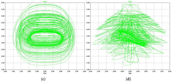 The simulation results of the circuit from Figure 7: (a) X−Y plane; (b) Y−Z plane; (c) Z−W plane; (d) W−X plane.
