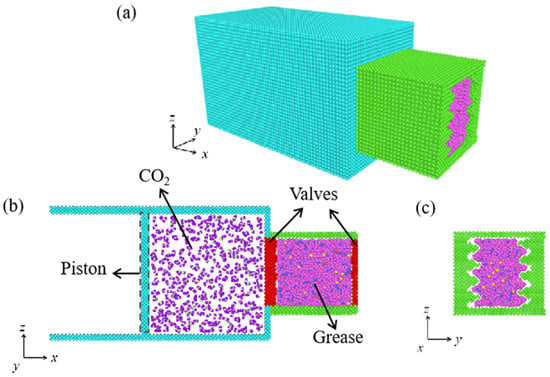 The model consisted of a large high-pressure box connected with a channel, as given in Figure 1. The box and the channel are filled with CO2 and sealing grease, respectively. Inside of the box, a plane is set as a piston at the left side to apply external forces to the CO2, thus maintaining a constant pressure during the sealing simulation. The initial internal dimensions of the box are about 164, 73, and 95 Å along the x-, y-, and z-directions, respectively. The amount of CO2 molecules in the systems is kept at 1056 in all cases. The box, the channel, and the piston plane are set as rigid bodies during the simulation to avoid any deformations. On the left and right edges of the channel, rigid valves are set to confine the grease and isolate it with CO2 before the sealing process. The non-periodic boundary conditions are set along all three directions.