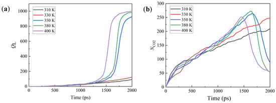 To determine the effect of T on the performances of greases, T = 310, 330, 350, 380, and 400 K are employed in the simulations, all of which are above the critical temperature of sCO2. The leakage quantity QL, shown in Figure 2a, demonstrates several different stages. When the simulation time t ≤ 1000 ps, the cases with different T almost show the same QL. With t > 1000 ps, the cases with T > 330 K show an increased QL, followed by its sharp increase to a stable value. However, for those with T ≤ 330 K, their QL increases slowly with t.