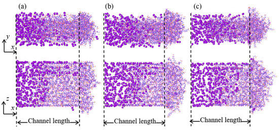 The atomic visualization in Figure 14 shows that with a small hc, the leakage of CO2 molecules is mainly realized by their diffusion through the interface between the greases and the channel. This is because, in this case, there are little voids or free volumes in the y–z plane formed by the distribution of grease molecules, which hinder the diffusion of CO2 into the greases. Moreover, the small leakage rate of CO2 in this case is because of spatial crossover as the small amount of grease becomes suppressed in the channel and thus becomes well-attached to the channel to hinder the diffusion of CO2 through the interface. With the hc increasing, both the voids formed by greases and their molecular crossover become enhanced, and thus the CO2 can easily diffuse into the greases and their interface with channels, resulting in an increased leakage rate.