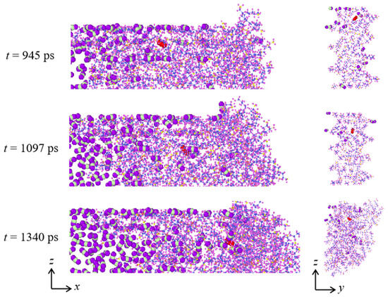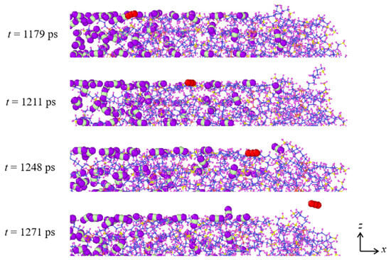 The leakage path of high-pressure CO2 molecules through the grease is quite important to understand the sealing performance of greases. The atomic visualizations show that at low temperature (e.g., T = 330 K), the CO2 molecules inside of the channel are mainly distributed on the interface between the grease and the channel in a disordered manner, which is different from the literature [,]. These CO2 molecules diffuse along the interface, and part of them is finally released by passing through the whole interface, as shown in Figure 4. With the T further increasing (e.g., T = 330 K), besides the interface as leakage paths, CO2 molecules distributed inside of the grease can also continue to penetrate into the grease and are finally released. This can be verified by tracking the movement of certain CO2 molecules, as in the configurations given in Figure 5. These configurations are captured by slicing the grease in its middle part, and the targeted CO2 molecule is labeled in red. It is evident that this molecule can move toward the outlet, and its position is always inside of the grease, thus validating that the diffusion of CO2 molecules inside of the grease contributes to their leakage at high T. Therefore, it is evident that the leakage paths at a low T are dominated by the interface between the grease and the channel, but they consist of both the interface and the bulk penetration through the grease at a high T.