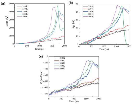 The performance of grease molecules can be further examined by evaluating their MSD, the x-directional position of the mass center Xm, and their interaction energy Ec with the channel, as given in Figure 6. Both the MSD and Xm show a gradual increase with T = 310 and 330 K but a sharp increase with a higher T, which is consistent with the changes in QL with T in Figure 2. This is because the diffusion or movement indicated by the high MSD corresponds to the fact that the grease molecules can hardly stay stable in the channel, and thus it is difficult to inhibit the leakage of CO2. Moreover, with T > 330 K, both the MSD and Xm show a large drop following the peak. This because when the grease molecules are extruded from the channel, they tend to attach to the outer surface of the channel under the effect of atomic interactions, thus showing a decreased Xm as well as the MSD.