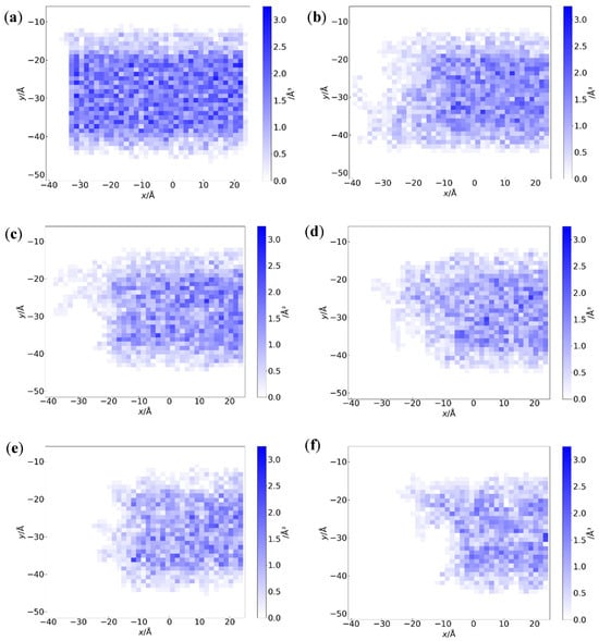 Density distribution, ρg, of grease molecules inside of the channel in the x–y plane at (a) the initial moment and at the simulation time of 1.3 ns in (b–f), corresponding to 310, 330, 350, 380, and 400 K, respectively.