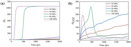 The sealing performance of greases greatly depends on the pressure (P), as given in Figure 8. It can be seen that the QL shows a gradual increase with t for P ≤ 50 MPa, but it demonstrates a dramatic increase with P > 50 MPa. A similar change trend is also observed for the amount of CO2 molecules, NCO2, staying in the channel. The changes in both the QL and the NCO2 indicate that the cases with a small P have an increased leakage rate of CO2, but the ones with a large P might indicate that the greases are extruded from the channel.