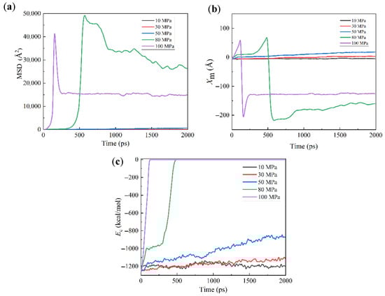 Activities of grease molecules can be further examined from their MSD and Xm, as shown in Figure 9. Both the MSD and the Xm have a nearly linear increase with t for the cases with P ≤ 50 MPa, but they show a dramatic increase followed by a sudden drop for the cases with P > 50 MPa. Such a dramatic increase verifies that the greases have been extruded from the channel, while the sudden drop is due to their movement after extrusions. Their interaction energy Ec with the channel also demonstrates a dramatic increase for the cases with P > 50 MPa and a clear difference between the cases with P ≤ 50 MPa. Comparing the changes of Xm and Ec, such a difference in Ec begins at the very beginning of the simulation, which has a small difference in Xm. This fact indicates that a high P might greatly promote the diffusion of CO2 molecules into the interface between the greases and the channel and thus cause the increase in QL.