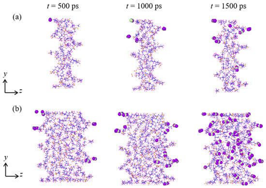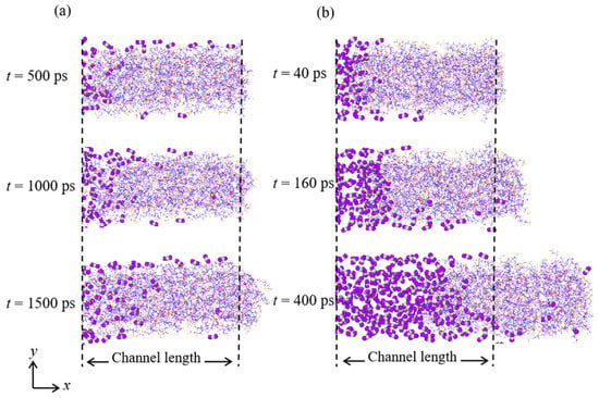 The presence of these different QL and NCO2 under various T can be explained by examining the atomic snapshot of the simulation, as given in Figure 3. It can be seen that at T = 310 K, the CO2 molecules diffuse into the grease and can pass through it, resulting in their leakage. Moreover, the grease stably stays in the channel during the whole simulation and exhibits blockage effects [], and thus the CO2 molecules are accumulated inside of the grease, resulting in a gradually increased NCO2. This increased NCO2 further accelerates CO2 molecules passing through the grease, resulting in a slight increase in the increased trend of QL. The above phenomenon is similar for the case at T = 330 K. However, for the cases with T > 330 K, with the increased NCO2 in the channel, the grease molecules are gradually extruded from the channel; that is, a decrease is induced in the quantity of effective greases hindering CO2 leakage. As a result, more CO2 molecules can pass through the grease and increase the QL observed in Figure 1a. However, it should be noted that the CO2 molecules can still be accumulated inside of the channel under the hindering effect of the grease. When the grease molecules are totally extruded from the channel, the CO2 molecules rapidly pass through the channel, thus causing a sharp increase in QL in this case and an evident decrease in NCO2. Because of the absence of grease inside of the channel, all of the CO2 molecules in the chamber quickly leak under the pressure, causing the QL to reach a stable value, which is indeed the total amount of CO2 molecules in the system.