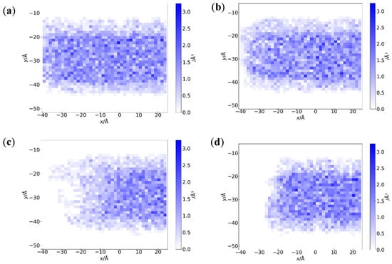 Density distribution, ρg, of grease molecules inside of the channel at the simulation time of 2 ns in (a–c), corresponding to 10, 30, and 50 MPa, respectively, and at the simulation time of 0.3 ns in (d) with 80 MPa.