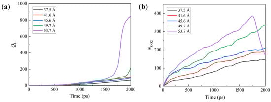 The effect of hc on the QL can also be verified by the changes in NCO2, as given in Figure 12b. For a small hc, the NCO2 shows a gradual increase, indicating the aggregation of CO2 molecules in the channel due to their diffusion, and the NCO2 increases with the hc at any appointed time. For the largest hc, the NCO2 exhibits a sudden drop after the maximum point, showing that the greases are extruded from the channel at this moment. Hence, it is evident that their leakage effect can be generally decreased by a high hc.