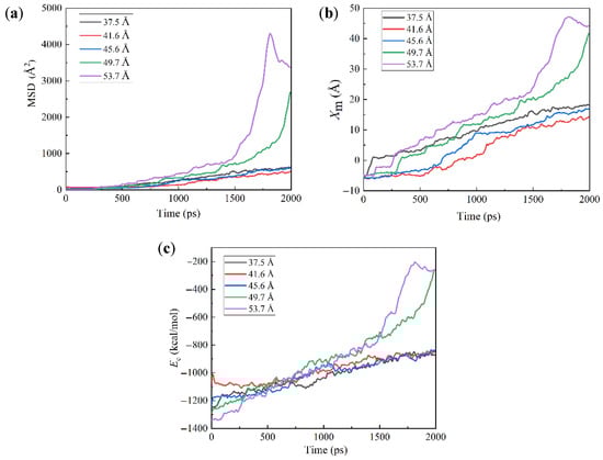The effect of hc can be further investigated by examining the MSD of grease molecules, the x-directional position of their mass center Xm, and their interaction energy with channel Ec, as given in Figure 13. For a large hc, both the MSD and Xm show a dramatic increase, which indicates the sudden acceleration of the greases and their extrusion from the channel. Moreover, Xm increases with the hc, showing that the fluidity of greases increases with a high hc, which is because the channel hardly confines the greases with the increases in hc. This can be proved by the fact that Ec greatly increases with the hc, which indicates a decrease in the forces between greases and the channel.