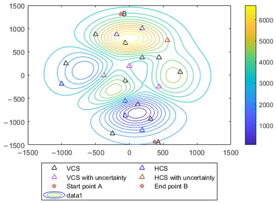 The designated flight region for the UAV is depicted in Figure 2, commencing at point A and terminating at point B. The UAV undergoes corrections from various GBSs throughout the flight. As illustrated in Figure 2, the black triangle and blue triangle signify vertical and horizontal correction ground base stations (noted as VCS and HCS), respectively. The pink and red triangles represent VCSs and HCS with probabilistic constraints, respectively. In Figure 2, the contour represents the terrain elevation profile across the designated UAV flight region. The isoclines (contour lines) indicate equal altitude levels. Both the x-axis and y-axis represent spatial coordinates in meters, forming a 2D ground projection of the environment.