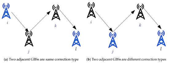 As shown in Figure 6b, when the GBS i and GBS k are of identical type, and the GBSs j and l differ from the former pair, then the constraints expressed in Equations (22) and (23) can also be satisfied for the GBS l. In this instance, it is pertinent to note that for the GBS l, it is only necessary to account for the cumulative errors associated with and . Consequently, the aforementioned constraints (22) and (23) can be simplified as follows: