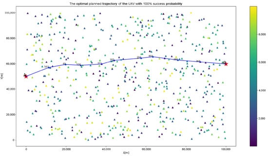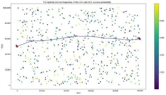 When the probability of a successful flight mission is 80%, the set is represented by (53). Figure 9 demonstrates the optimal planned trajectory of the UAV with 80% success probability. The alteration in the hue of the triangle depicted in Figure 9 signifies the variance in altitude of the GBS.