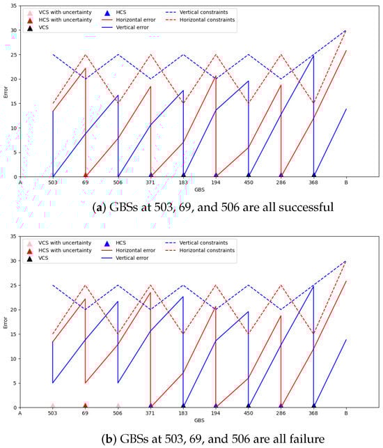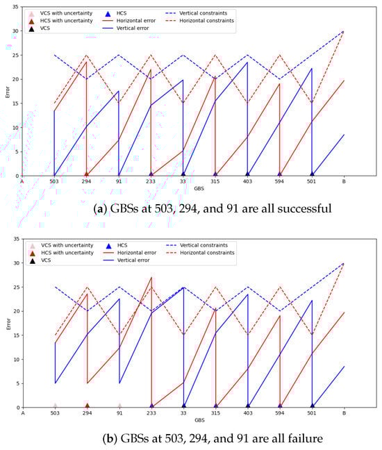 Conversely, the errors in Figure 10b show that the corrections of the three GBSs at 503, 294, and 91 are all failures. Figure 10b illustrates a scenario where the correction attempt at GBS 294 is unsuccessful, leading to a breach of constraint requirements at GBS 233 and consequently failing the flight mission. Failures in correction attempts at points 503 and 294 did not impinge upon the execution of the flight mission. Given that the probability of a successful correction for point 294 stands at 0.8, the overall probability of success for all designated tasks is estimated at 80%.