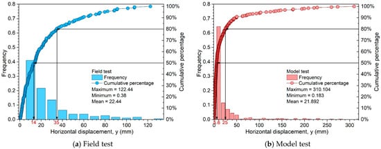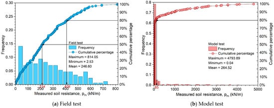 In order to have a clearer understanding of the target information in the established database, the histograms and cumulative distributions of pile shaft horizontal displacement and surrounding soil lateral resistance are drawn in Figure 1 and Figure 2. The horizontal displacements observed in the field and model tests are less than 122.44 mm (80% less than 35 mm) and 310.104 mm (80% less than 25 mm), respectively, as shown in Figure 1. The soil lateral resistance ranges from 2.53 to 814.05 kN·m−1 for the field cases and from 0.04 to 4793.89 kN·m−1 for the model cases (see Figure 2). The majority of values are less than 85 kN·m−1 in model tests and 408 kN·m−1 in field tests.