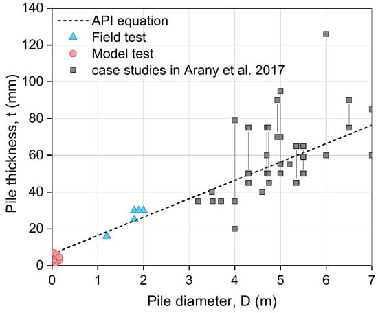 Figure 3 shows the plot of thickness against diameter in the database, with Equation (2) and data from other references also presented for comparison. The linear line in the figure represents the minimum wall thickness value suggested by the API specification []. Most field test piles in the database met this requirement, whereas none of the model test piles did. However, this is possible as the model testing piles were designed to serve prescribed research targets rather than real projects. The relaxation of this criterion was not expected to cause severe damage or consequences. Note that the API also specifies that the requirement for may be relaxed when the pile is not damaged during installation [].