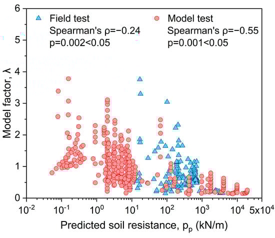 Figure 5 illustrates the plots of the model factors against the predicted values () for both the field and model test cases. In general, as the predicted soil resistance increases, the model factor visually exhibits an overall decreasing trend. Spearman rank correlation tests were applied to the datasets, showing correlation coefficients of −0.24 for the field tests with a p-value of 0.002 and −0.55 for the model tests with a p-value of 0.001. For both cases, the correlation values are negative and the p-values are less than 0.05. These results confirm a statistically significant negative correlation at the 0.05 significance level. This is an undesirable outcome as it means that the prediction accuracy would be dependent on the magnitude of the predicted value. The randomness criterion of the model factor is then not satisfied.