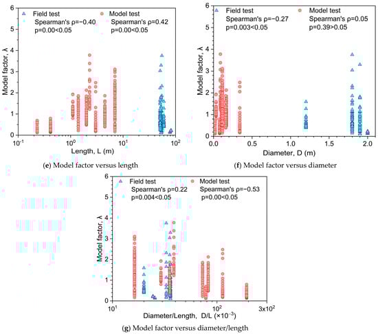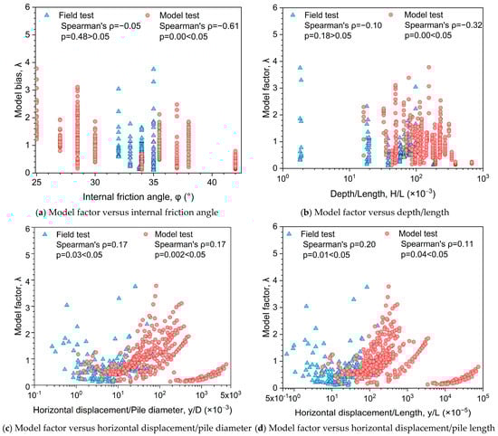 To examine the source of the above model dependency, the model factors were tested against the input parameters by Spearman rank correlation tests. These parameters include the internal friction angle (), ratio of depth to pile length (), ratio of horizontal displacement to pile length (), ratio of horizontal displacement to pile diameter (), pile length (), pile diameter (), and ratio of pile diameter to pile length (). The corresponding plots are shown in Figure 6.