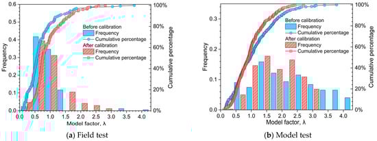 Based on the above analyses, for the field test, the final expression for can be expressed as ; and for model testing, the final expression can be determined as . With Equation (4), the model factor after calibration can be written as