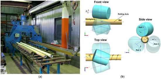 An efficient industrial technology of two-phase titanium alloy round cross-sectional bars is radial shear rolling (RSR) [5]. In the modern classification of metal forming processes, radial shear rolling (RSR) is defined as a special case of stationary screw rolling of solid workpieces by rolls with special calibration using a three-roll mill in the range of large feed angles (18° and more). Due to friction forces, the cylindrical workpiece is rolled between three work rolls, which form a deformation zone. During the rolling process, the workpiece moves along a helical trajectory, and it simultaneously decreases in the radial direction and lengthens in the axial direction.
