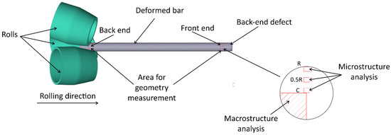 To check the correctness of the model, the following main process parameters were compared: bar geometry (diameter, length, and ovality), back-end defect shape change, rolling time, and process temperature.