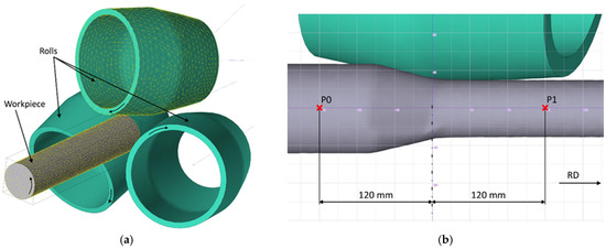 RSR process was simulated using the finite elements method (FEM) with the QForm 3Dv11 software. The 3D models of the rolls and workpieces were designed in the SolidWorks v20 CAD system. The roll and workpiece positions are shown in Figure 3a. The shapes of the workpieces and tools were set fully identical to the experimental ones. The rolls were hollowed for simulation time-saving (Figure 3a).