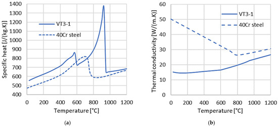 Thermophysical properties of VT3-1 and 40Cr alloys as a function of temperature: (a) specific heat and (b) thermal conductivity.