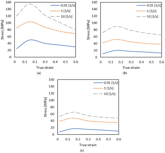 Stress–strain curves of the VT3-1 alloy at different temperatures and strain rates: (a) 900 °C; (b) 1000 °C; (c) 1100 °C.