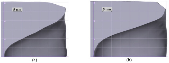 A distinctive feature of bars rolled in screw mills is the formation of back-end defects, which are irregularly shaped cavities at the bar ends. Digital model verification included a comparison between the dimensions and shape of the back-end defects for bars rolled in different experimental modes (Figure 6). The depth of the back-end defects obtained as a result of simulation was 35 mm and 40 mm after rolling at 1060 °C and 980 °C, respectively. The respective parameters obtained in the experiment differed but slightly, i.e., 34 mm for Mode 1 and 40 mm for Mode 2. The clear visual similarity of the shape and curvature of the back-end defects suggests correct workpiece shape change simulation.