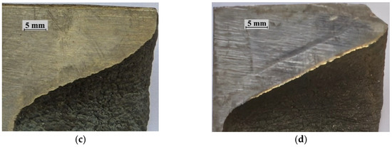 Appearance of back-end defects at rolled bar front end: (a) simulation, Mode 1; (b) simulation, Mode 2; (c) experiment, Mode 1; (d) experiment, Mode 2.