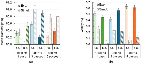 Figure 7a shows the front-end (f.e.) and back-end (b.e.) bar diameters averaged over all the process modes. The average diameter for experimental rolling varied in a range of 60.01 mm to 60.57 mm, while the difference between the front and back bar end diameters ranged from 0.12 mm to 0.37 mm. The simulated average diameter varied in a range of 60.35 mm to 61.02 mm; the absolute difference between the front and back bar end diameters was 0.17 mm. In relative units, the difference between the simulated and experimental data is within 1%.