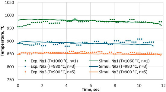 Table 4 summarizes the absolute and relative error, as compared with the simulated data. The maximum deviation is within 28 °C (or 3%) for Mode 1. The results of the comparison of the surface temperature of the deformed bar at the exit of the deformation zone reflect the high accuracy of predicting the thermal state of the bar. This suggests that the digital model can be relied upon to analyze the thermal state of the workpiece with a high degree of reliability.