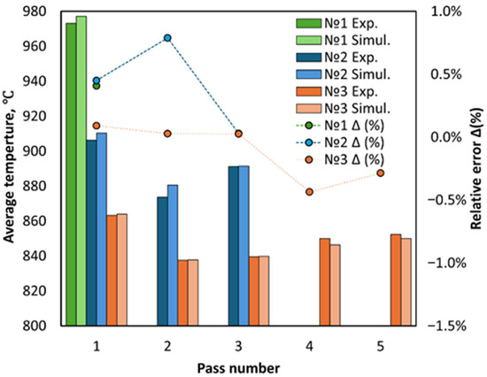 The diagram (Figure 9) presents a comparison between the average bar surface temperature at the exit of the deformation zone for each pass, from the experimentally measured and the respective simulated data, as well as the relative error. The average temperature error is within 1% for all passes.