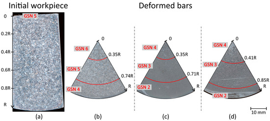 The cross-sections of the bars deformed at 980 °C and 900 °C exhibit three zones, the GSN of which grows from 2 at the surface to 4 in the axial zone (Figure 10c,d).